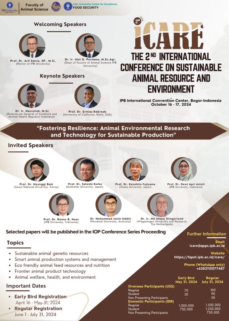 We are delighted to extend this invitation for you to participate in ICARE 2024, scheduled to take place from October 16-17, 2024, at IPB International Convention Center, Bogor, Indonesia. Organized by the Faculty of Animal Science, IPB University, this biennial event serves as a dynamic forum where experts come together to exchange knowledge, share experiences, and build robust networks aimed at addressing the evolving challenges in animal science. Our overarching theme, “Fostering resilience: animal environmental research and technology for sustainable production” will encompass discussions on a wide array of topics in animal production.